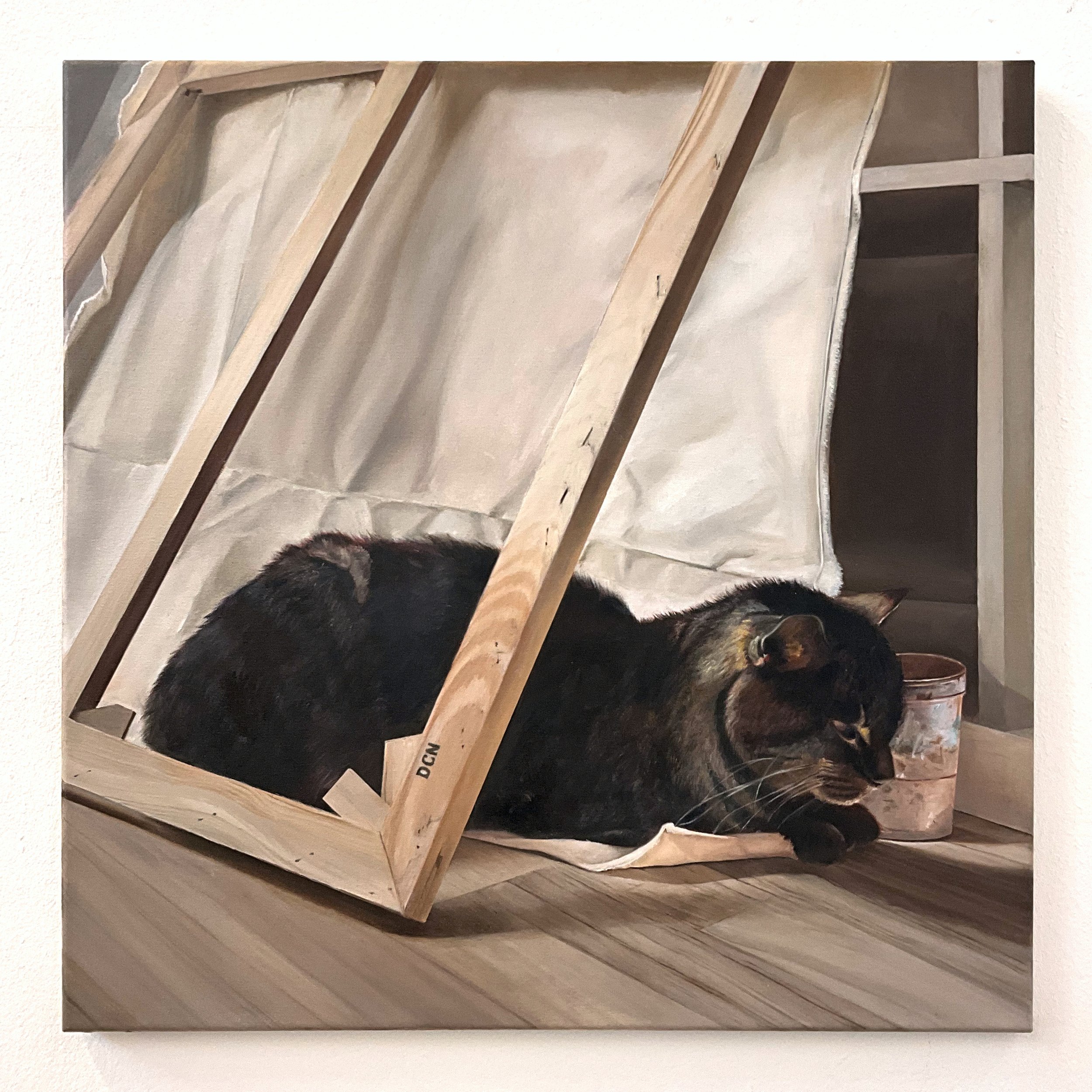 Katze zwischen Holz und Stoff auf Holz und Stoff, Öl auf Leinwand, 60 x 60 cm, 2023
